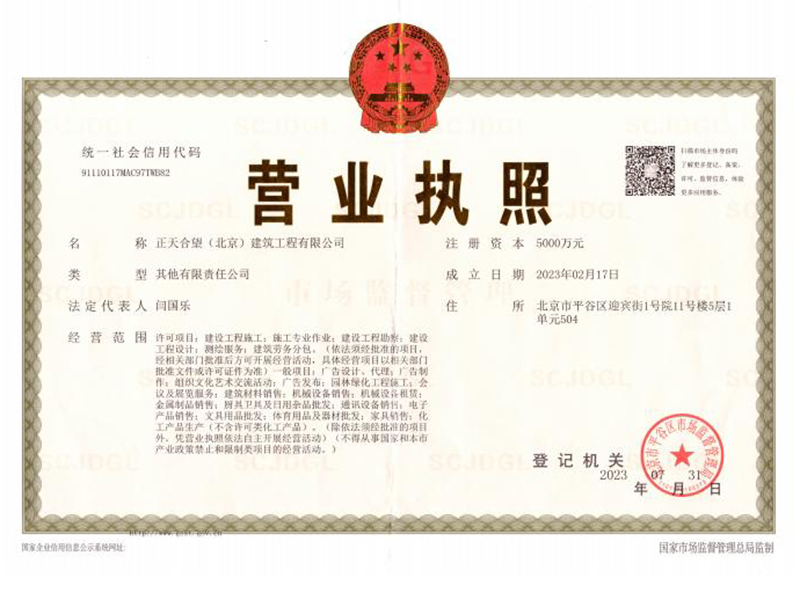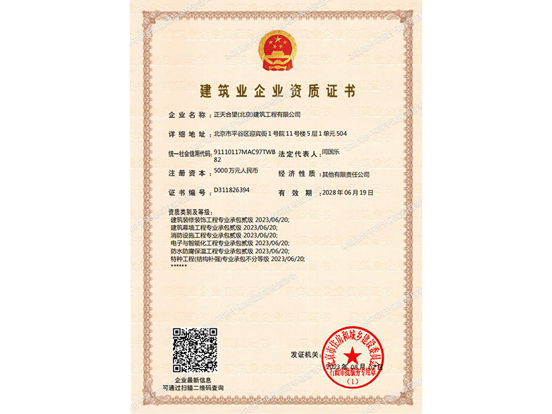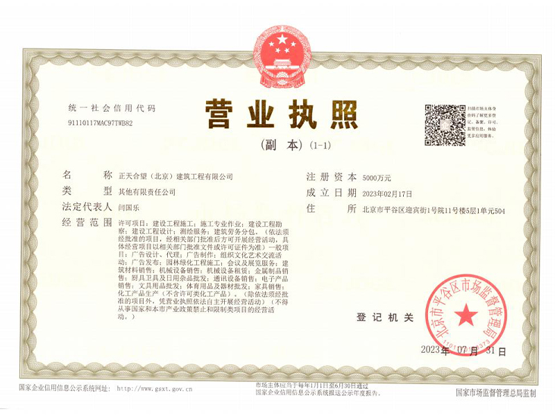 正天合望(北京)建筑工程有限公司成立于2023年,是一家专注于建筑工程领域的现代化企业,总部位于北京市平谷区。公司注册资本5000万元,拥有国家颁发的多项建筑业资质,致力于为客户提供高品质的工程建设、设计、施工及配套服务。